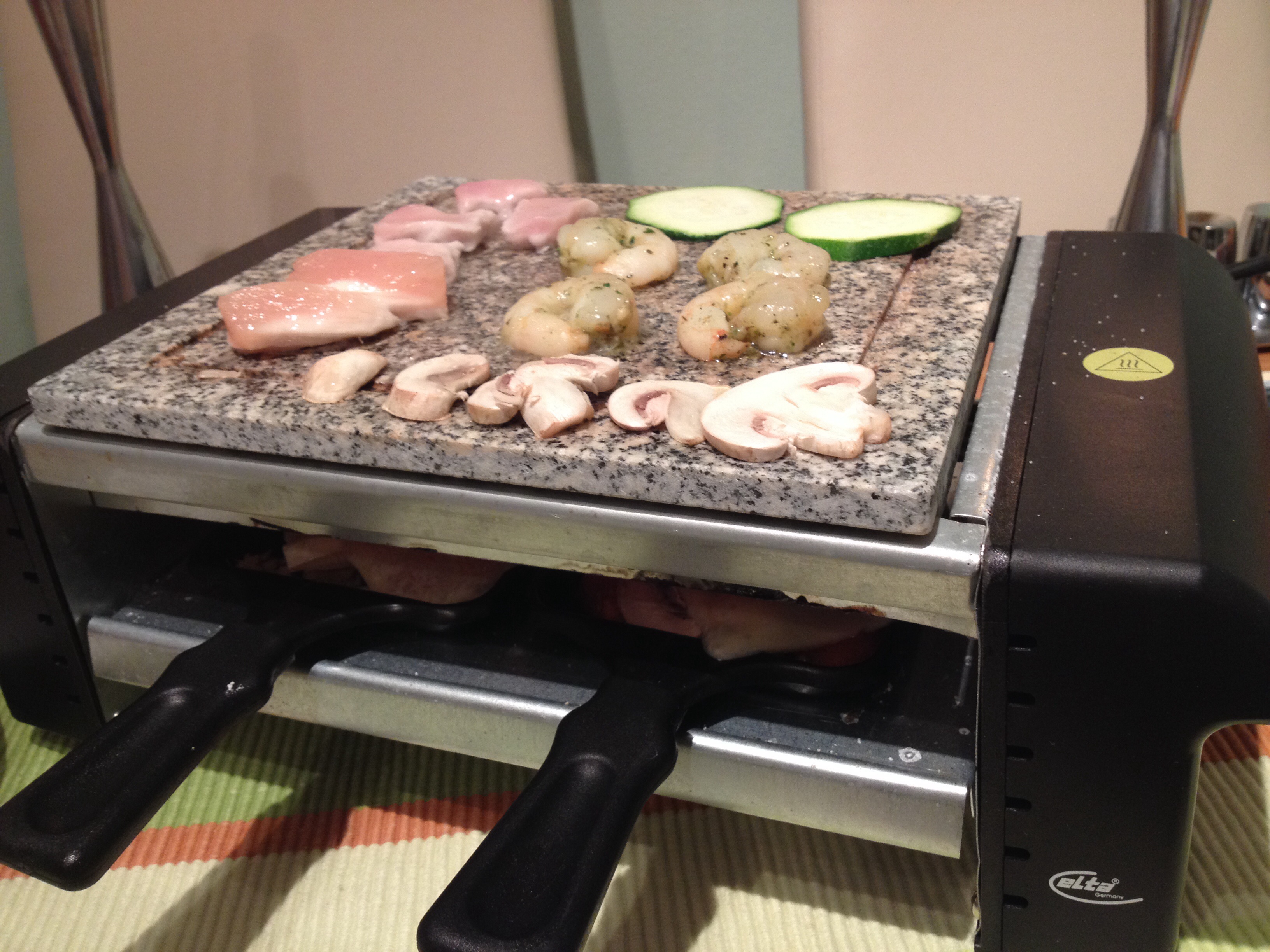 Imagine a small grill plate that sits on the centre of the table. On top you can cook whatever you like BBQ style, but underneath is the exciting part. Underneath there is a grill space where you can load up a small shovel with food, top it with cheese and grill it to your heart’s content.