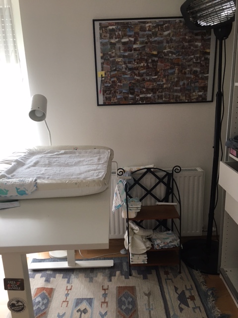 And then I realised… the nursery wasn’t actually going to get used. Since the recommendation is to keep the baby in the same room as the mother for the first 6 months (and I realise that doesn’t always happen, but I was going to try), then technically he wouldn’t need a nursery for 6 months. Instead of preparing the nursery, I should have been preparing my own room! I didn’t want to have to carry him next door to change him in the middle of the night. Luckily there was plenty of space, so my standing desk became the change table, and I decked out the small shelves that had previously held my laptop and office equipment with nappies and wipes. I cleared some space in the linen cupboard to store some baby clothes (for midnight changes) and his daily requirements.